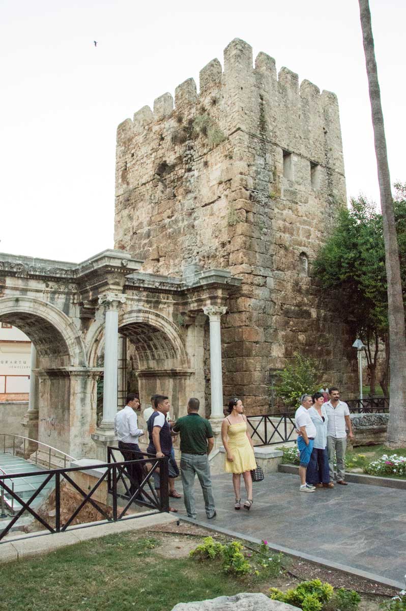 Antalya ist heute die fünftgrößte Stadt der Türkei mit rund 1,2 Millionen Einwohnern. Moderne Wohnviertel ziehen sich die Küste entlang nach Osten oder folgen den großen Ausfallstraßen. Sie ist der Hauptort der weiten Küstenebene, die in der Antike Pamphylien genannt wurde und von Griechenland aus besiedelt wurde. Die vielen Ausgrabungsstätten wie Aspendos, Perge oder Syllion künden noch heute von dieser Besiedelung. In römischer Zeit war Antalya, das damals Attaleia hieß, bedeutendster Hafen der weiteren Umgebung und war, vermutlich um das Jahr 48 n. Chr., Reisestation des biblischen Apostels Paulus (Apostelgeschichte 14,25 f.). Eine Kirche lässt sich jedoch erst ab dem 5. Jahrhundert belegen (die heutige Kesik Minare Camii). Im Jahre 130 nach Christi Geburt besuchte Kaiser Hadrian die Stadt, woran der Hadriansbogen noch heute erinnert. Und genau hier, am Hadriansbogen, begann ich heute morgen meinen Rundgang durch die Stadt. Zierlich, fast filigran erscheint mir das Bauwerk, das zwischen zwei dicken, quadratischen Türmen wie eingeklemmt wirkt. Der Verkehr auf der Hauptstraße, der Atatürk Cadesi, braust lautstark vorbei.