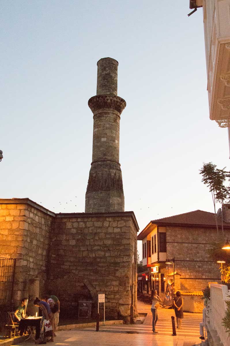 Das heutige Straßenniveau liegt gut einen Meter höher, Stufen führen hinunter zur römischen Straße. Wer mag wohl hier schon alles durchgegangen sein? Römische Kaiser und römische Legionäre, Ritter und Kreuzfahrer, Kaufleute und Bauern auf dem Weg zum Markt. Die Straße führt mich direkt in die Altstadt. Links und rechts immer wieder Läden mit Nützlichem und Überflüssigem. Man sollte seinen Geldbeutel schon festhalten, jeder Laden ist ein Versuchung und das Freigepäck ist beim Flug ja beschränkt. Dann taucht vor mir ein seltsamer Bau auf, ein schient ein Minarett zu sein, doch wirkt es seltsam unvollständig. Das ist es auch, der Turm war ein Minarett, das zu einer Moschee gehörte, der obere Teil bestand aus Holz, das jedoch dem Zahn der Zeit zum Opfer gefallen ist. Doch die Geschichte des Baues reicht noch weiter zurück, ursprünglich war es eine Kirche, die im fünften Jahrhundert aus den Steinen antiker Bauten errichtet worden ist. Der ganz Bau wird heute Kesik Minare - abgebrochenes Minarett genannt.