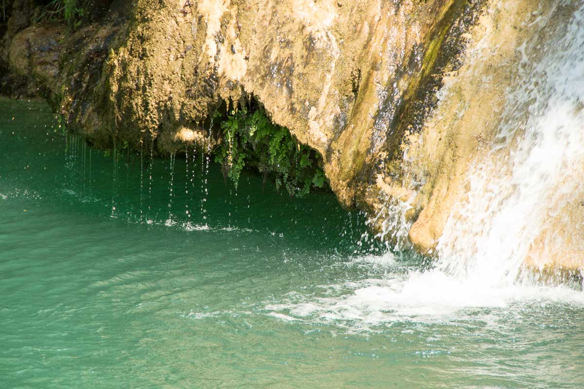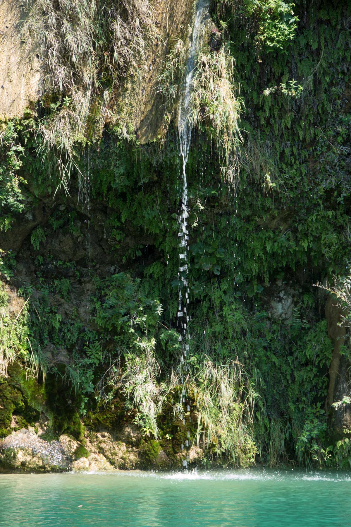 Trockenen Fußes bzw. Reifen geht die Fahrt nun weiter, immer noch auf Feldwegen, hinter uns ein dichte Wolke Staub. Dann rollen wir durch ein hölzernes Tor, der Weg senkt sich und wir stehen auf einem kleinen Parkplatz. Ein Esel, der sich im Schatten der Fliegen erwehrt, begrüßt uns lauthals. Etwas steif klettern wir aus unserm Gefährt und stehen dann staunend für einem Naturschauspiel, das wir in der so trockenen Landschaft nicht erwartet hätten - den Ucan Su - Fall. Über eine Felswand aus Kalktuff rieselt das Wasser eines Baches hinab und fällt rauschend in einen kleinen See. Die dichten Laubbäume geben Schatten, es ist eine kleine Oase im weiten trockenen Land. Das Wasser in dem kleinen See ist klar und sauber, kleine Fische schwimmen darin herum und begutachten neugierig unsere nackten Füße, die wir zur Abkühlung, immerhin hat es 35 Grad Hitze, ins kühle Nass strecken. Die großen, ausgewachsenen Kollegen schwimmen in einem anderen Becken, daneben lehnen einige Angelruten an einem Baum. Ob wir hier unser Mittagessen selbst angeln müssen? Doch Mehmed, unser Fahrer, beruhigt uns, es sei alles schon bestellt. Und tatsächlich, als wir in einer offenen Laubhütte Platz genommen hatten, die etwas oberhalb des Teiches auf einigen Felsen steht, serviert man uns Platten mit gegrilltem Fisch, lecker gewürztem Hühnchen, eine große Schüssel Salat und, ganz wichtig, ein frisches Efes-Pilsner. Und während einige Mutige Badekleidung angezogen haben und fröhlich im Wasser herumplantschen, genießen wir unsere Mahlzeit. Nach dem Essen breitet sich Müdigkeit aus, ein Himmelreich für einen Liegestuhl und ein weiteres Bier. Das Bier bekomme ich, der Liegestuhl bleibt Wunschvorstellung, denn Mehmed drängt zum Aufbruch. Der Weg ist zwischenzeitlich nicht besser geworden, wieder werden wir kräftig durchgeschüttelt, bis wir in einem kleinen Ort auf (wie schön) eine geteerte Straße kommen. Hier ist scheinbar irgend etwas los, auf dem Dorfplatz, neben einer kleinen Moschee, stehen bärtige Männer und unter einer alten Platane sind Stühle und Tische vollbesetzt. Ja, klar, es ist Freitagnachmittag, in der Türkei als muslimisches Land ist das der freie Tag der Woche. Irgendwann haben wir das kleine Sträßchen mit einer großen, zweispurigen Straße vertauscht und in rasanter Fahrt geht es wieder Richtung Küste. Der Fahrtwind weht durch die offene Karosse und bläst den ganzen Staub von uns ab. Trotzdem, wir freuen uns auf eine Dusche im Hotel und auf einen Sprung ins Meer, auch wenn wir wehmütig zurückdenken an unser kleines Paradies in den Bergen.
