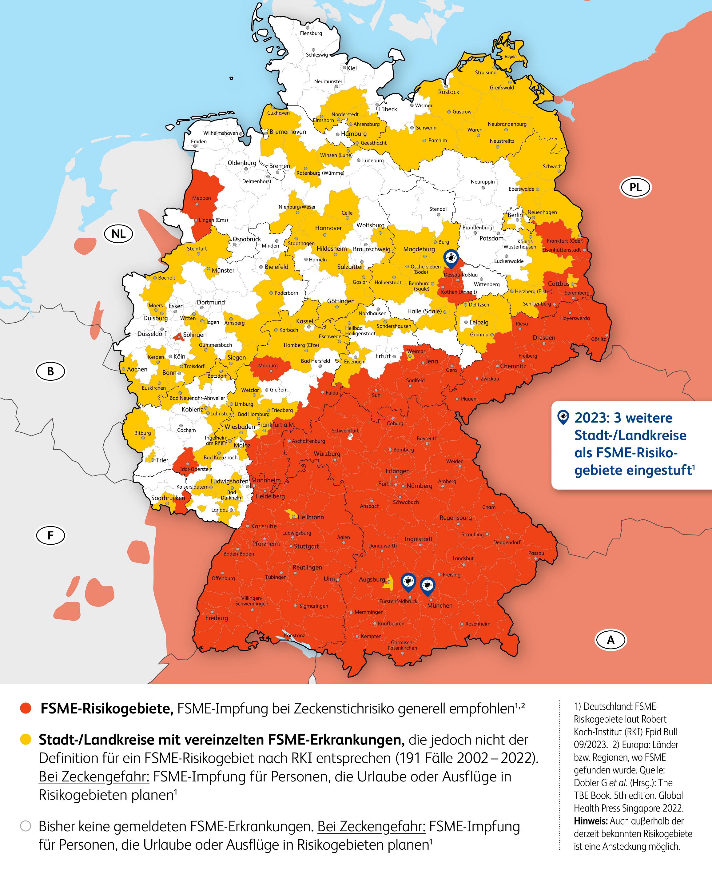 Das Robert Koch-Institut (RKI) hat Anfang März drei neue FSME-Risikogebiete ausgewiesen: den Stadtkreis München und Landkreis Fürstenfeldbruck in Bayern sowie den Landkreis Anhalt-Bitterfeld in Sachsen-Anhalt.