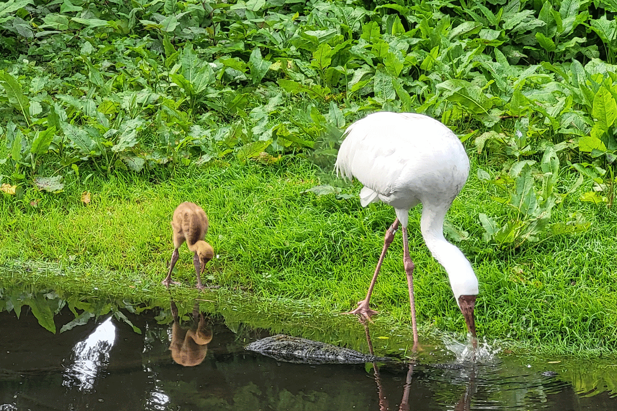 Schneekranich Mama „Cleopatra“ und ihr Nachwuchs beim Wasser trinken am Kranichsee im Weltvogelpark / FOTO: Weltvogelpark Walsrode